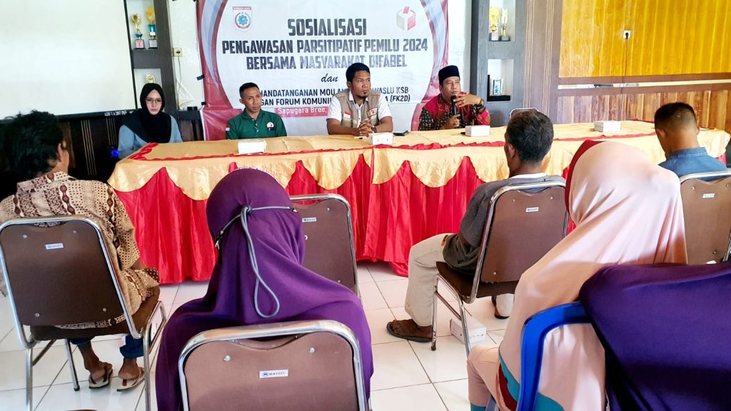 Fhoto Bersama dengan Masyarakat penyandang Difabel\n\n\n\nGufran, Anggota Bawaslu KSB dalam Sambutannya menyampaikan bahwa“Saudara-saudara memiliki hak suara yang sama. Kami sebagai penyelenggara Pengawas Pemilui punya kewajiban untuk menfasilitasi penyaluran hak-hak tersebut,” ujar Koordinator Devisi Pengawasan Pencegahan dan Humas Bawaslu KSB saat sambutan.